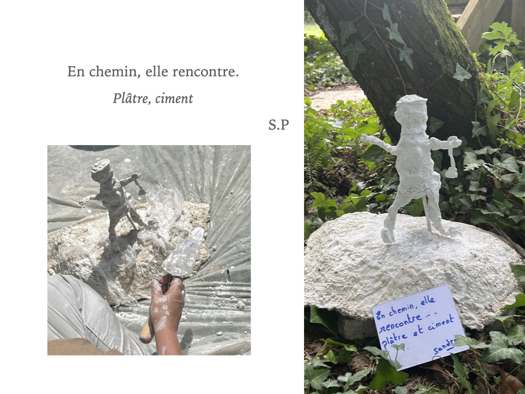 Cette sculpture raconte le parcours d’une voyageuse arrivant au point culminant d’une colline. Petite pause… regarder le paysage de ce point de vue panoramique… reprendre son souffle. ”